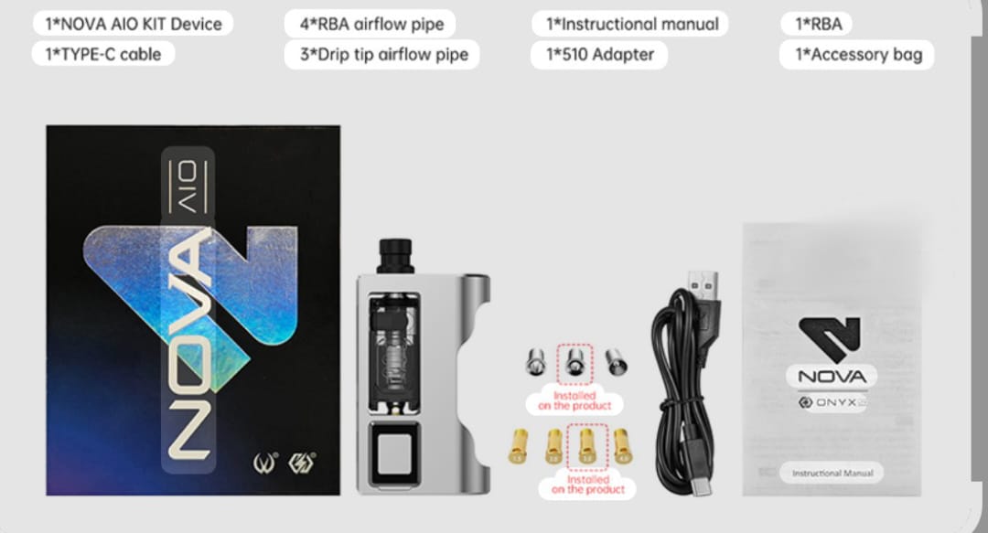 | Paquete | 1 x Kit PULSE AIO V2, 4 x Tubos de flujo de aire RBA, 1 x Manual de instrucciones, 1 x Adaptador 510, 2 x Boquillas, 1 x RBA, 1 x Bolsa de accesorios, 3 x Tubos de flujo de aire para boquillas |